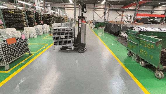 走进繁忙的车间,主通道上叉车和AGV小车在往复穿梭。该区域铺设的是灰色聚氨酯超耐磨地坪,其优异的抗冲击、高负载性能和适中的表面弹性,可以有效缓冲叉车和AGV小车持续通行带来的动态压力,显著降低噪音,同时大幅延长地面使用寿命。